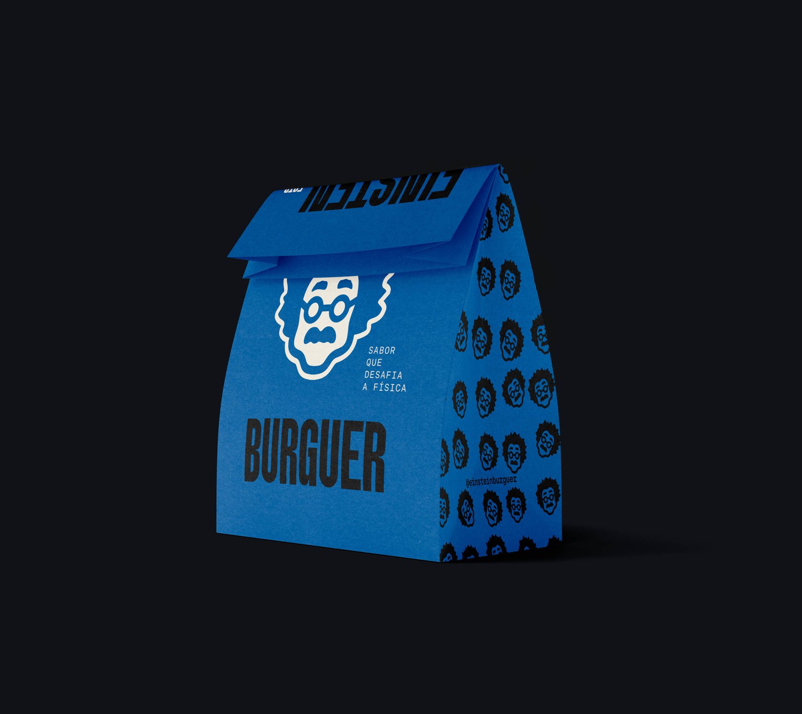 O saco delivery tornou-se o ícone máximo do Einsten Burger — um verdadeiro embaixador visual. Mais do que uma embalagem, ele é o símbolo da disrupção: instantaneamente reconhecível pela cor azul e pela fotografia com cartolina, sempre destacando a sacola como protagonista das composições.