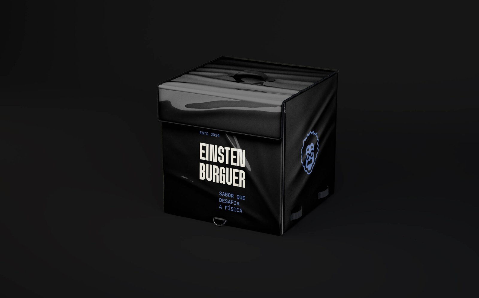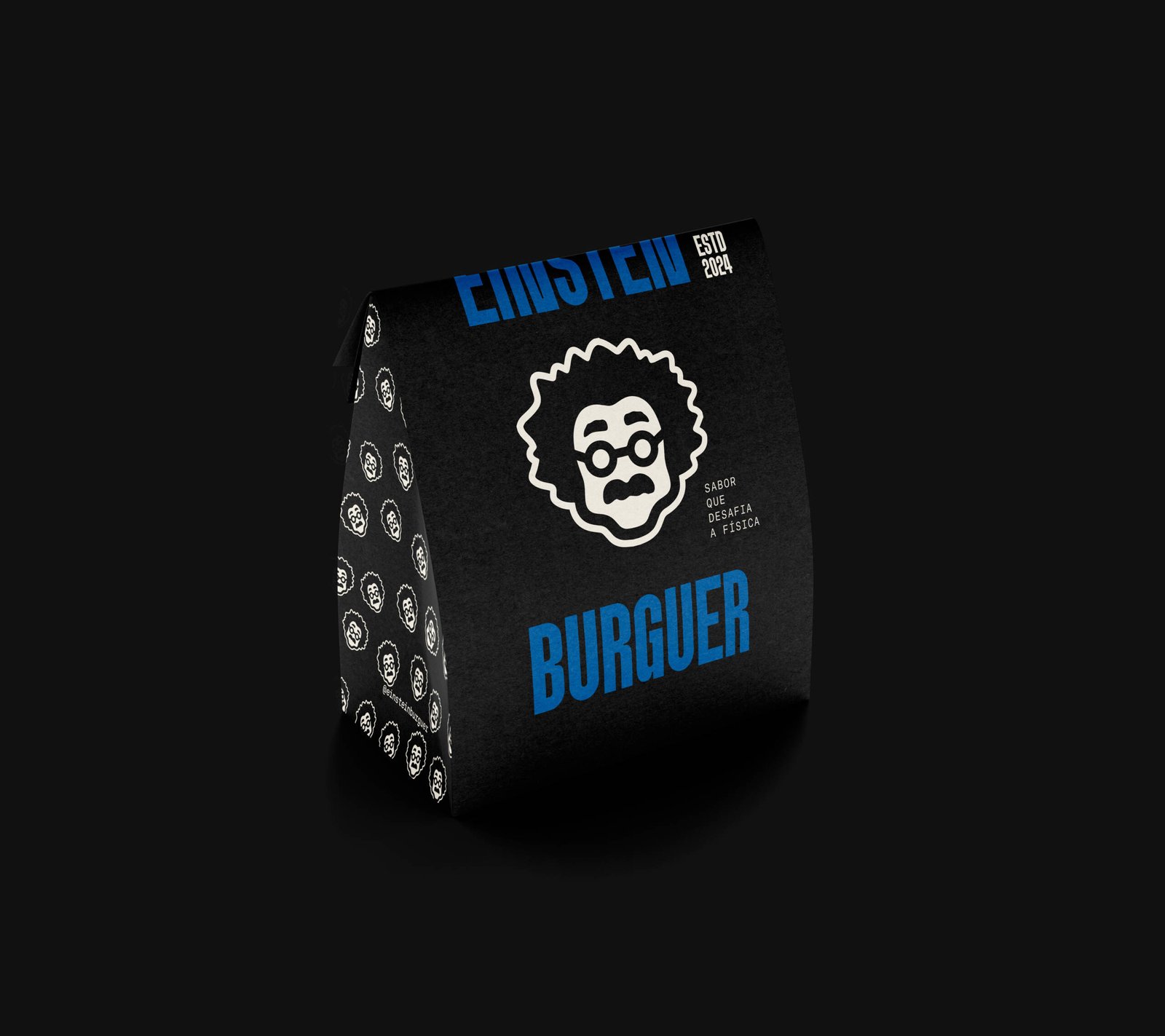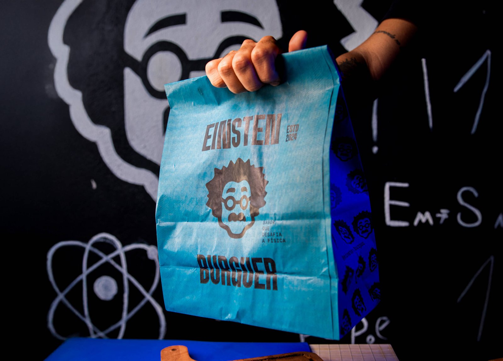O saco delivery tornou-se o ícone máximo do Einsten Burger — um verdadeiro embaixador visual. Mais do que uma embalagem, ele é o símbolo da disrupção: instantaneamente reconhecível pela cor azul e pela fotografia com cartolina, sempre destacando a sacola como protagonista das composições.